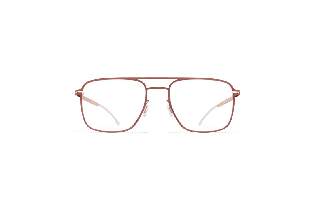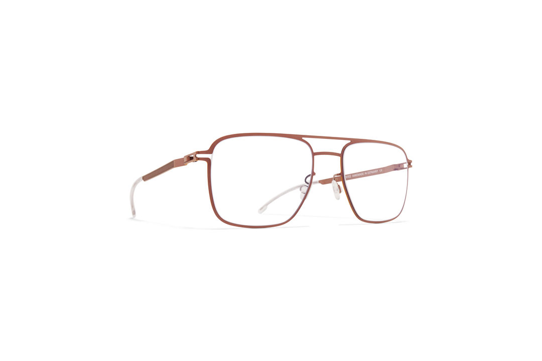 ML11 in der Farbe Shiny Copper/Leica Yellow Edges mit Clear Gläsern aus der MYKITA | LEICA Kollektion ist eine eckige Brille in einem puristischen, zeitlosen Look aus leichtem Edelstahl. Handgefertigt in Berlin.