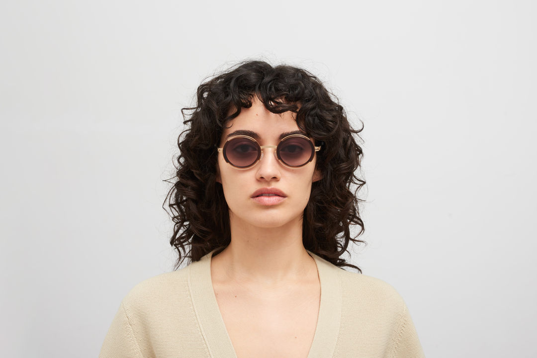 Das Model trägt PEARL in der Farbe A90-Champagne Gold/Zanzibar mit Cedar Brown Gradient Gläsern.