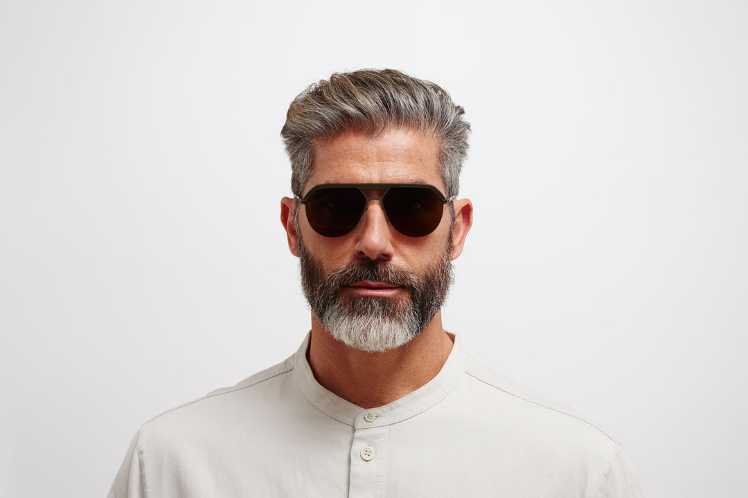 Made of lightweight stainless steel with a MYLON top bar, ML02 in MH51 Safari Green/Graphite with Leica Brown Polarised lenses is an aviator shaped sunglass frame from the MYKITA | LEICA collection. Handcrafted in Berlin.