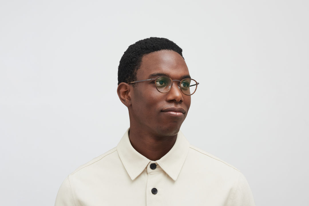Made of lightweight stainless steel and slender acetate, KIRIMA in A47 Mocca/Zanzibar with Clear lenses is a panto shaped optical frame from the MYKITA LITE ACETATE collection. Handcrafted in Berlin.