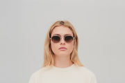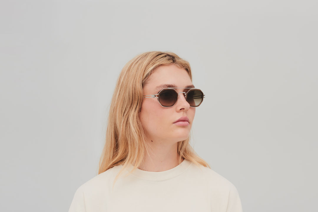 The model wears ARTURO in colourway A92 Shiny Silver/Galapagos with Rawbrown Gradient lenses.