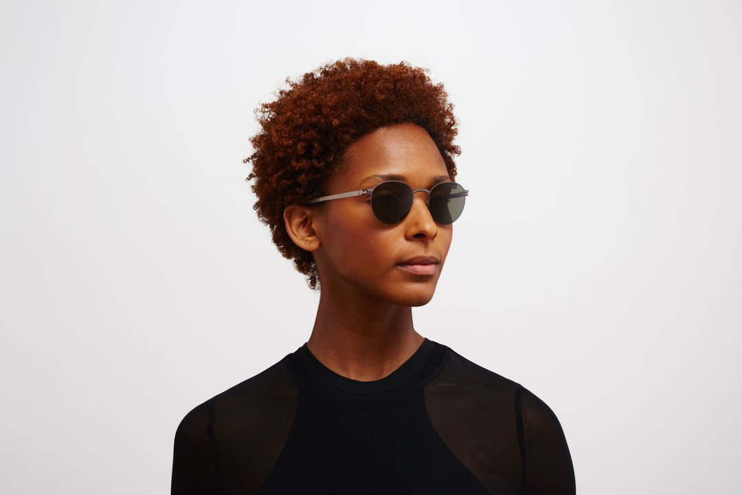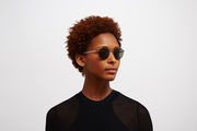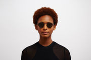 The model wears CARLO in colourway Mocca/Dark Sand with Raw Green Solid lenses.